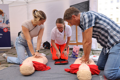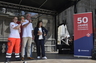 Die zahlreichen Besucher:innen konnten bei Erste-Hilfe-Mitmachstationen ihr Ersthelferwissen auffrischen, für die Unterhaltung der kleinen Gäste sorgte Clownin Sally und die Johanniter-Rettungshundestaffel zeigte gemeinsam mit der Wiener Berufsfeuerwehr, dass Hund und Retter:in sich im Notfall auch 40 Meter abseilen lassen.