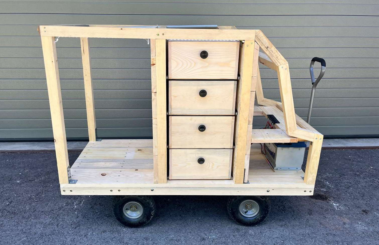 Die Firma Holzbau Zwatz stellte dankenswerterweise Konstruktionslatten, Bretter und Schrauben zur Verfügung, mit denen das Grundgestell zusammengebaut werden konnte. Um Stauraum zu gewinnen, wurden auf der rechten Seite des Wagens Schubladen eingebaut. Eine Autobatterie sorgt für die Stromversorgung der Signalleuchten und des Folgetonhorns.