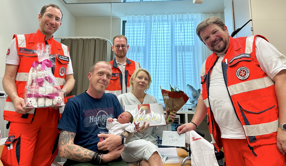 Gestern schauten die drei Johanniter-Geburtshelfer bei der kleinen Lea und den glücklichen Eltern Jennifer Wolff und Mario Hoffmann vorbei und gratulierten herzlich zum Familienzuwachs mit Blumen, Glückwunschkarte, Naschereien, Windeltorte und einem Johanniter-Babystrampler.