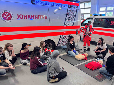 Am 24. April erwartete die Teilnehmerinnen ein abwechslungsreiches Programm: Sie besuchten unter anderem das Johanniter Forschungszentrum, wo sie innovative Technologien hautnah erleben konnten. Nach einer Einführung in die Tätigkeit des Forschungsteams folgte eine Demonstration des „Chameleon-Projekts“, bei dem Drohen mit Videoübertragung zum Einsatz kamen – inklusive eines spannenden Search-&-Rescue-Modus, bei dem eine Puppe als „Verletzte“ geortet werden musste. Außerdem wurde das Projekt GAIN vorgestellt – eine Virtual-Reality(VR)-basierte Trainingsstrategie, die Rettungskräfte auf diskriminierende Handlungen und belastende Situationen vorbereitet. Im Rahmen einer Führung durch das Haus erhielten die Schülerinnen zudem spannende Einblicke in die Einsatzzentrale, besichtigten den Mannschaftsraum und konnten auch die Rettungsfahrzeuge erkunden. Ein weiteres Highlight war ein „Reanimationsduell“, das großen Anklang fand.