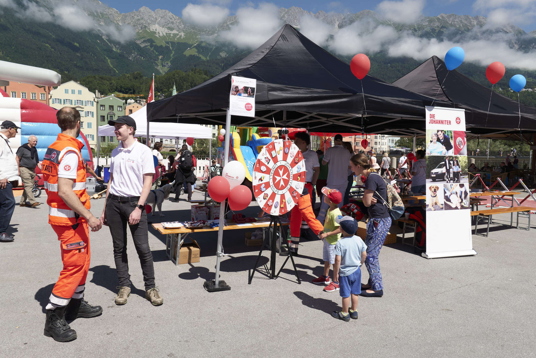 Vor den Zelten steht ein Glücksrad zum Thema Erste Hilfe. Davor stehen zwei Buben und eine Frau, die das Rad anschauen.