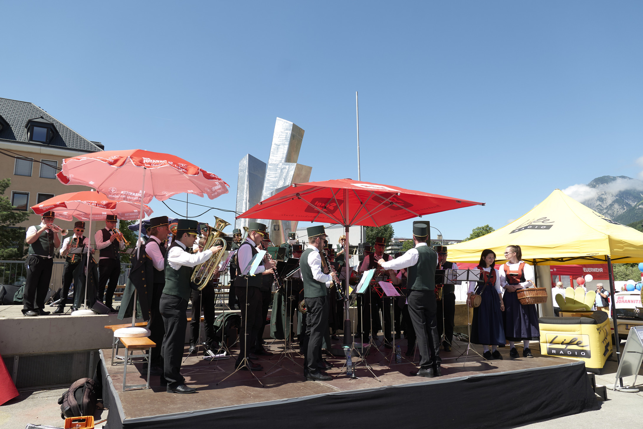 Eine Blasmusikkapelle spielt auf der Bühne.