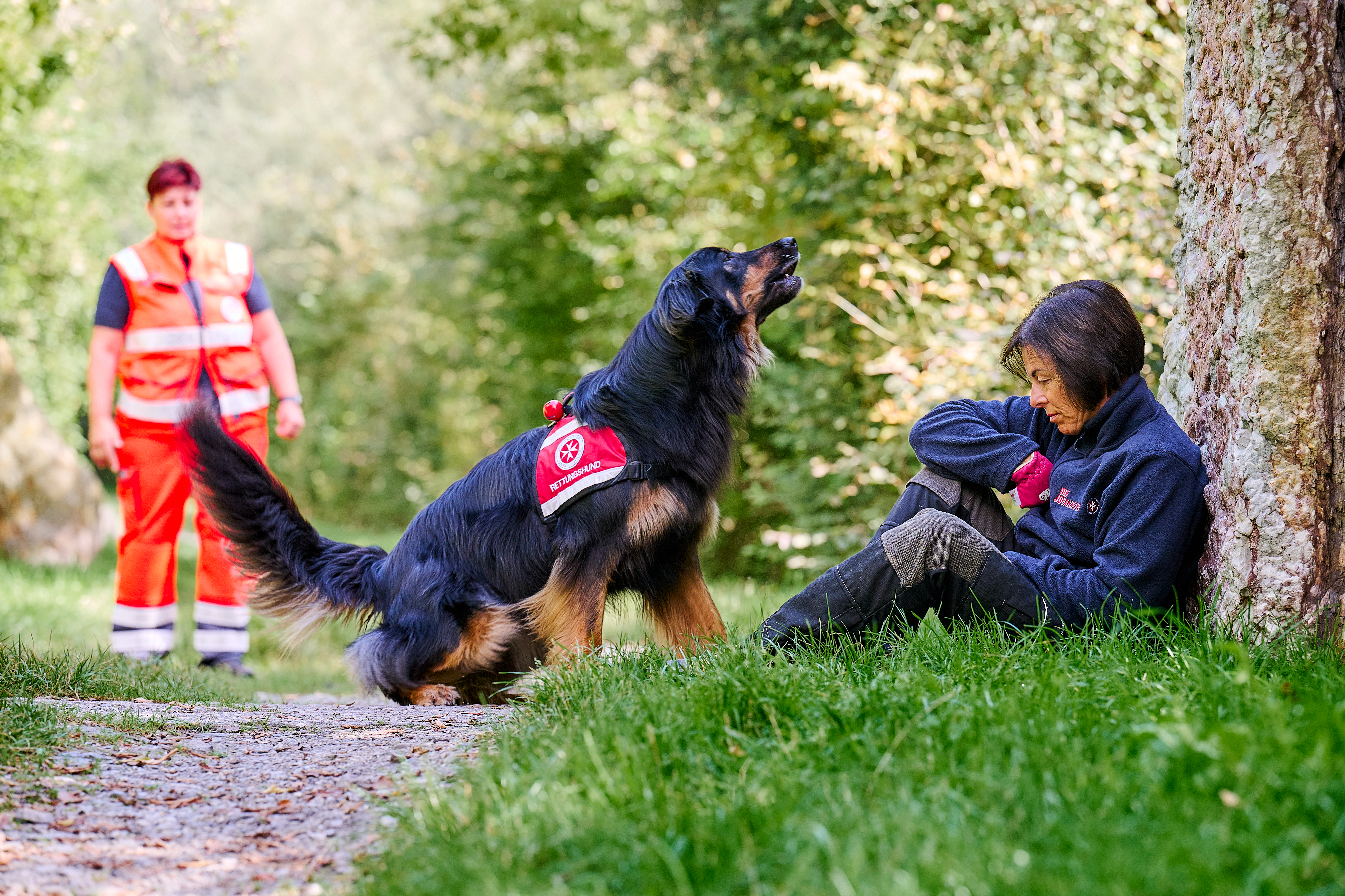 Der Rettungshund hat eine Vermisste gefunden und macht auf sich aufmerksam. Er bellt so lange, bis eine Helfer:in eintrifft.