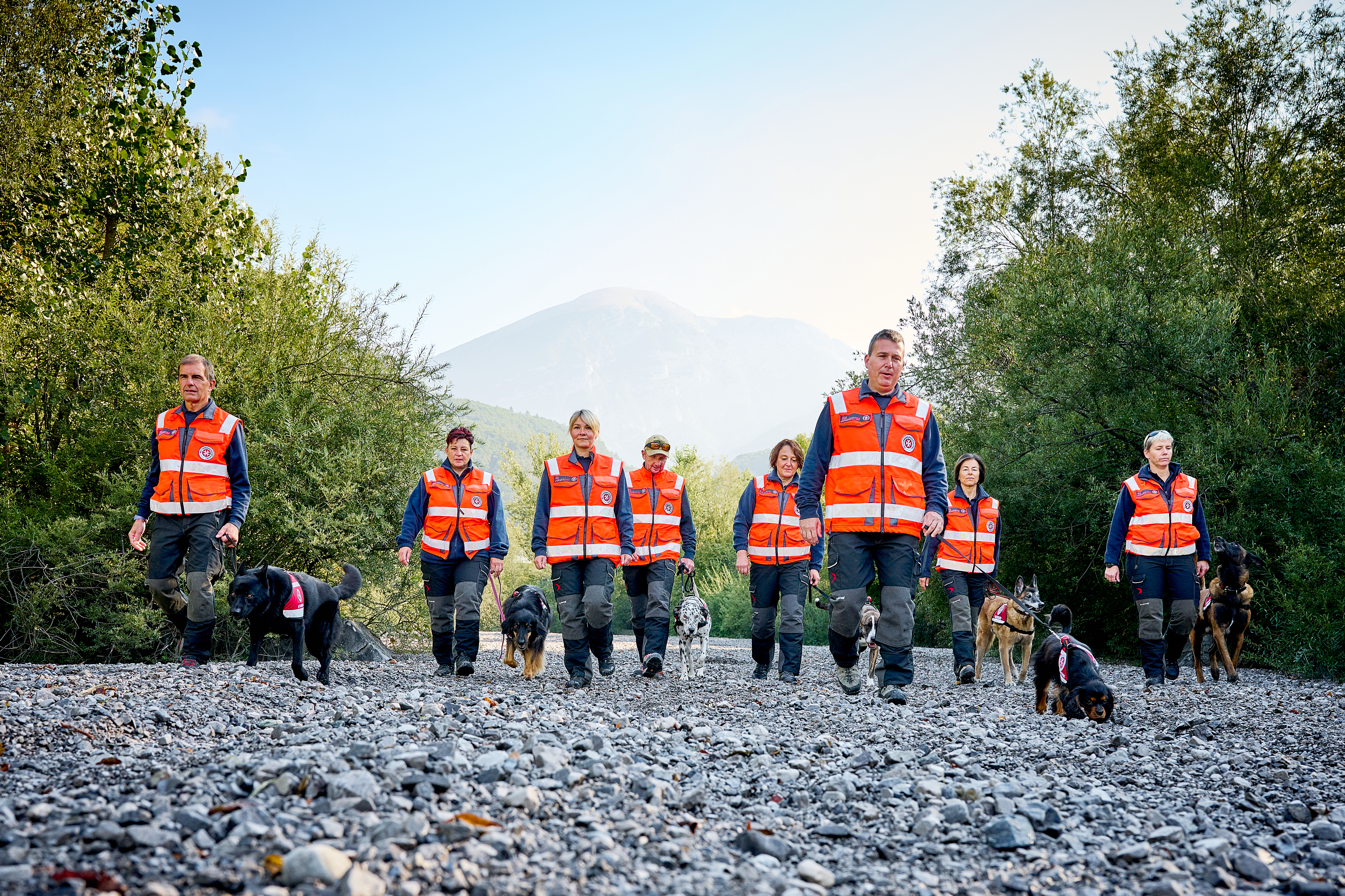 Rettungshunde werden in unterschiedlichen Disziplinen für die Suche nach Vermissten ausgebildet. Häufig trainieren sie die Flächensuche auf Wiesen und in Wäldern, um verunglückte Personen aufzuspüren.