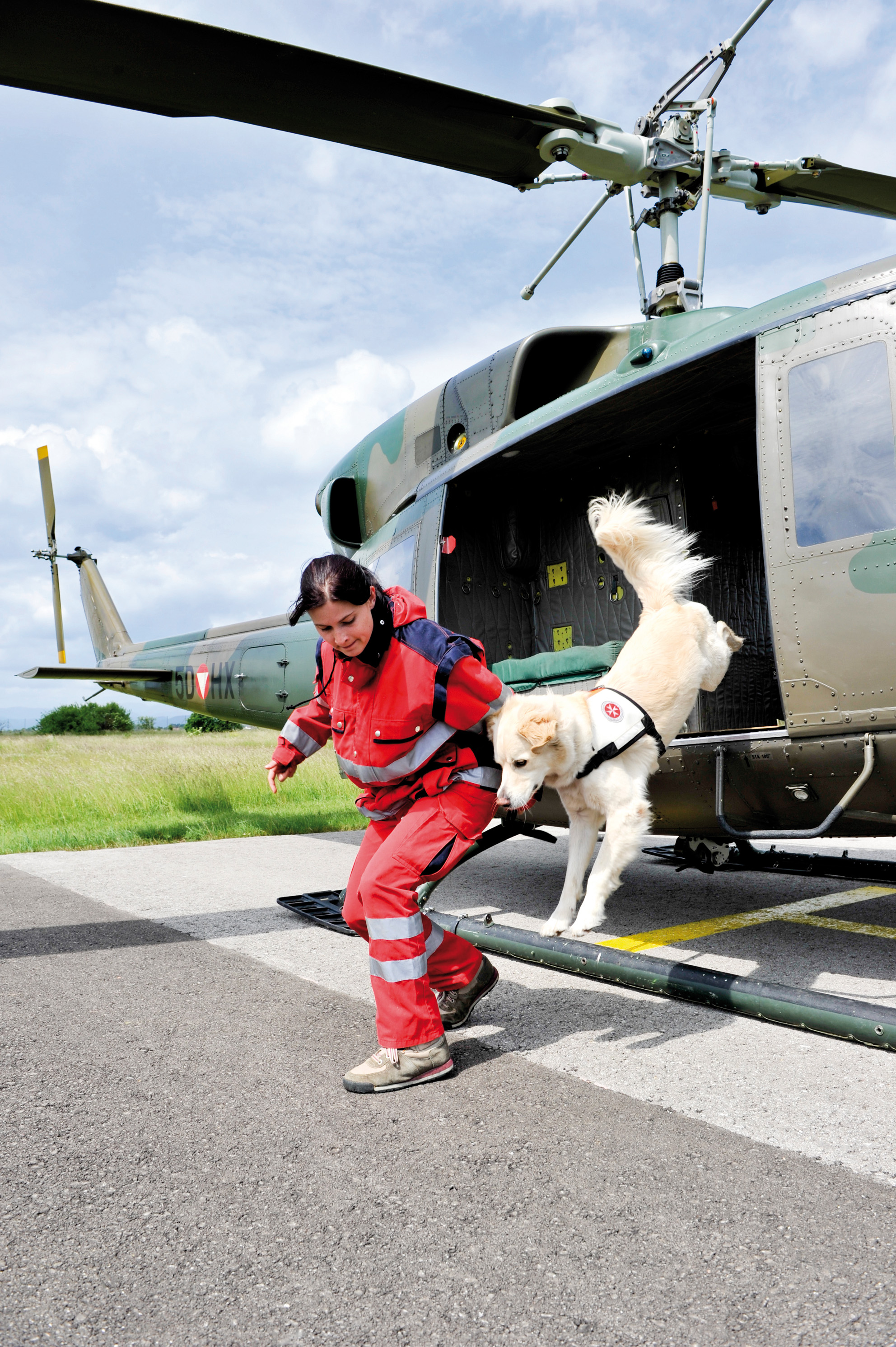 Beim Hubschraubertraining werden die Hunde zunächst an die Lautstärke gewöhnt. Danach üben sie mit ihren Trainer:innen das Ein- und Aussteigen sowie den Transport an der Winde.