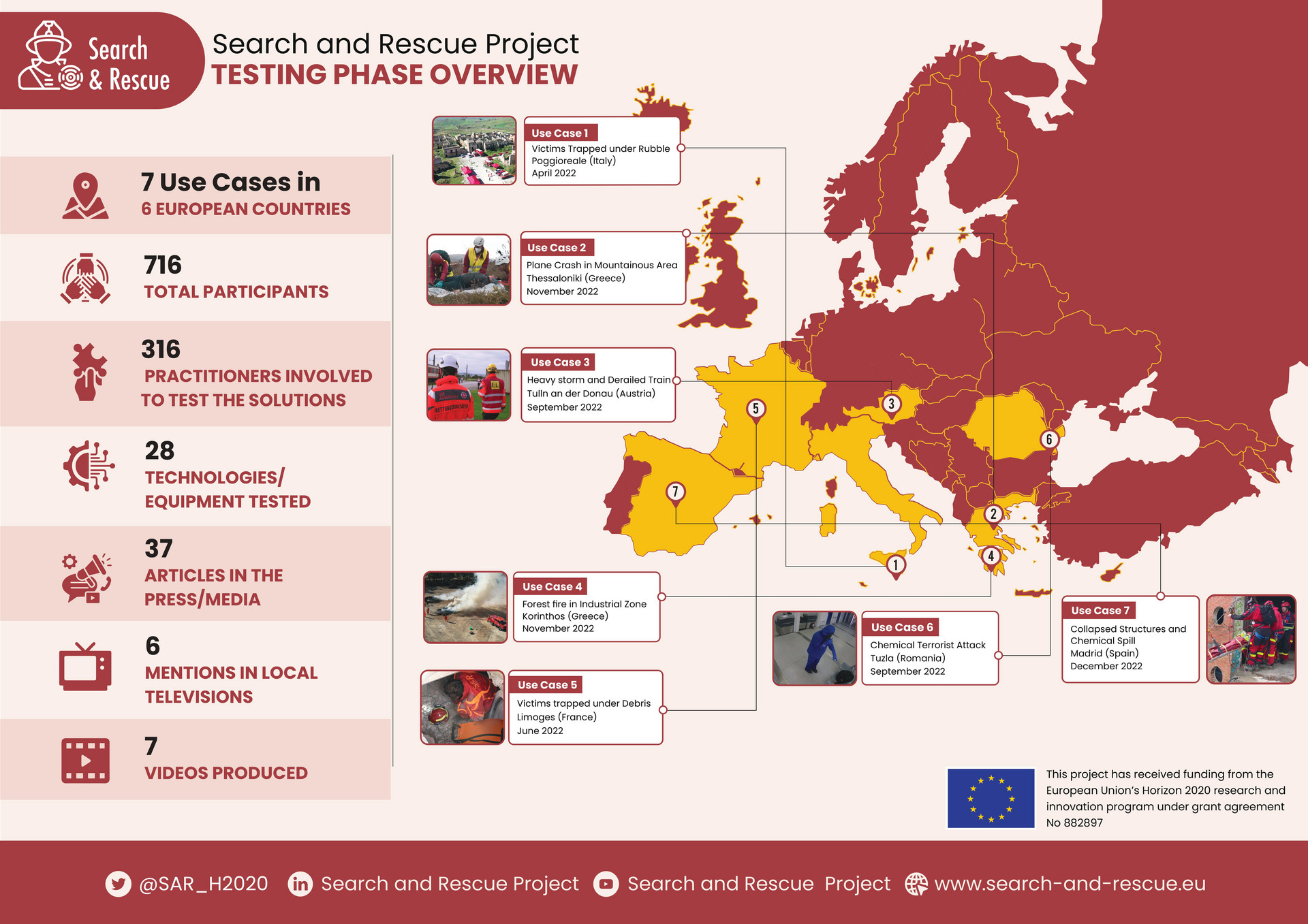 Jeder der sieben Use Cases im Projekt war einzigartig; die Szenarien in 6 verschieden Ländern reichten von Chemieunfällen, über Erdbeben bis hin zu Waldbränden. Insgesamt wurden in den sieben Use Cases 60 Testungen von 20 Technologien durchgeführt. Das Johanniter Forschungs- und Innovationszentrum unterstützte alle Use Cases bei der Evaluierung der Testungen.