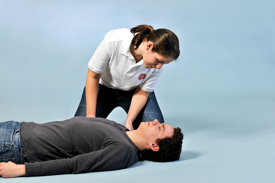 - Beugen Sie sich mit dem Kopf über die Person, schauen Sie in Richtung Brustkorb.