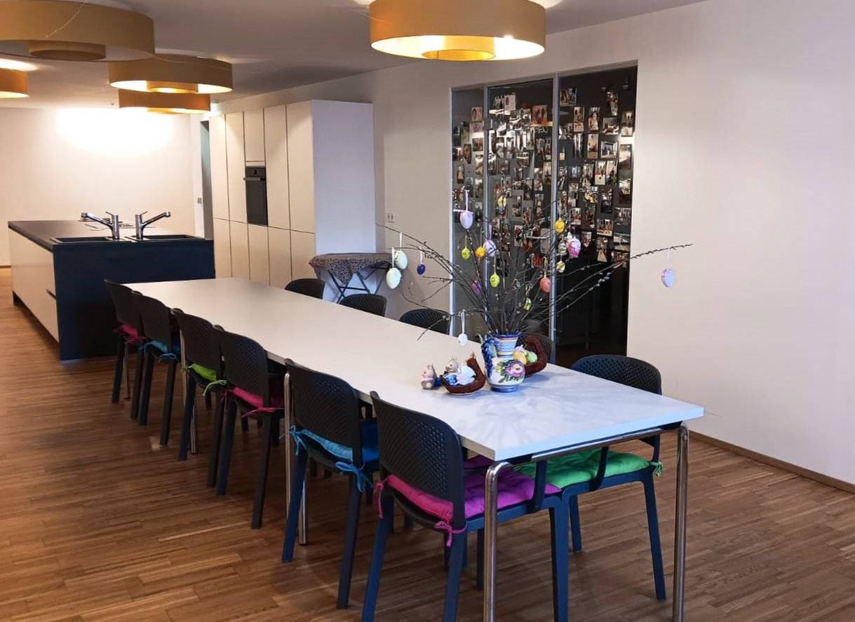 Jede Wohngemeinschaft besteht aus zwei Zimmern, einer Küche mit Essplatz, Sanitärräumen und einem Aufenthalts- und Schlafraum für die 24-Stunden-Betreuungskraft. Außerdem steht im Haus im Leben eine große Terrasse, eine Gemeinschaftsküche und ein erweitertes Wohnzimmer für alle Bewohner:innen zur Verfügung. Die Wohngemeinschaften richten sich primär an Personen aus dem Zillertal, die an Demenz erkrankt sind, denn „wir haben bereits in Volders festgestellt, dass der persönliche Kontakt zu Angehörigen wie Ehepartner:innen oder Kindern für die Bewohner:innen sehr wichtig ist“, erläutert Franz Bittersam. Zudem sind die Wohngemeinschaften nach dem Modell des Inklusiven Wohnens und Alterns ausgerichtet: „Unser Motto dabei ist: Gemeinsam ist man weniger allein!“, erklärt Franz Bittersam.